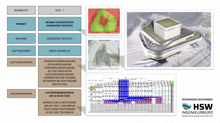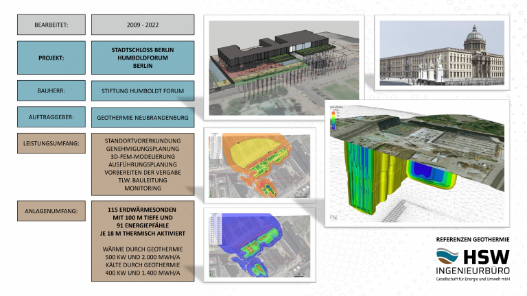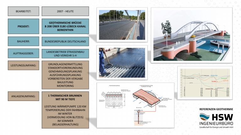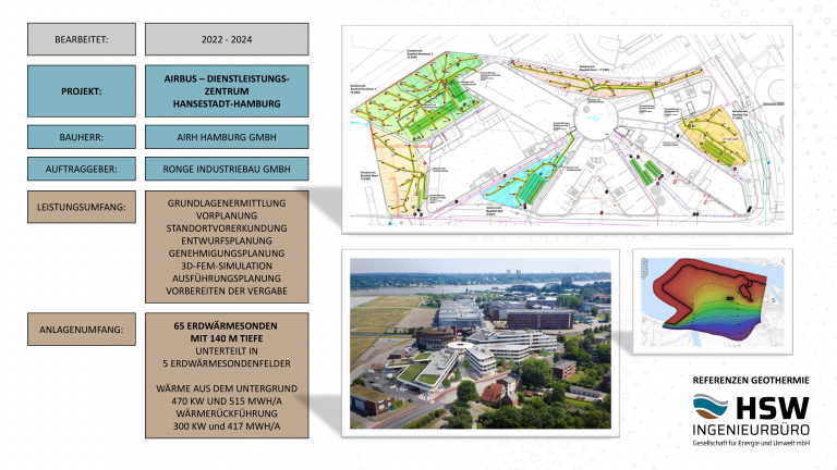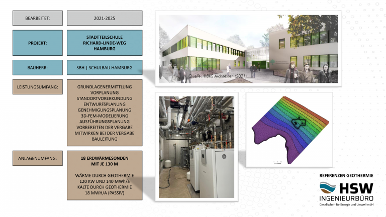 Der Arbeitsbereich hat sich in den zurückliegenden Jahren neben den üblichen Planungsleistungen auf viele fachorientierte und genehmigungsrechtlich relevante Fragestellungen im Bereich der Geothermie spezialisiert. So werden bereits seit 2005 geothermische Messungen (zum Nachweis bemessungsrelevanter thermophysikalischer Untergrundparameter mittels Geothermal Response Tests) durchgeführt und ausgewertet. Die H.S.W. GmbH verfügt dafür über insgesamt 3 Messgeräte, die vorrangig in Deutschland aber auch europaweit zum Einsatz kommen. Des Weiteren können besondere Leistungen wie z.B. die Erstellung von 3D-Untergrundmodellen und die Durchführung von thermohydrodynamischen Simulationen – z.B. als Auflagen/Forderungen der zuständigen Genehmigungsbehörden – erbracht werden.
