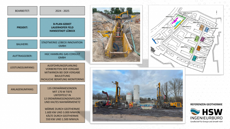 Bei der Projektierung von Gebäuden bzw. Quartieren mit einer vorgesehenen Nutzung oberflächennaher Geothermie wird neben der Planung der „Technischen Gebäudeausrüstung“ (TGA)“ eine fachlich fundierte Planung der Technischen Baugrundausrüstung“ (TBA) erforderlich. Die H.S.W. GmbH deckt hier den Bereich der TBA ab, der die maßgeblichen Bestandteile der geothermische Quellenanlage bis zur definierten Leistungsgrenze zum Gewerk TGA umfasst.